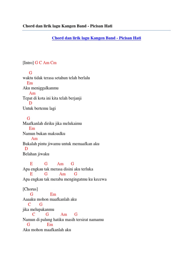 Chord Dan Lirik Lagu Kangen Band Picisan Hati